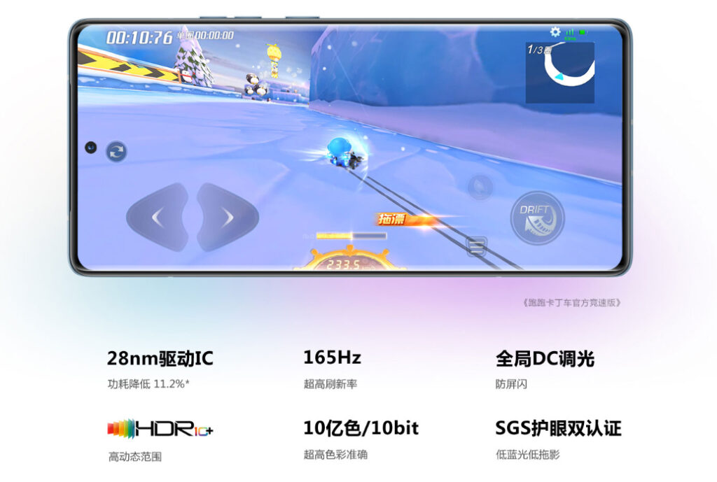 La pantalla es OLED de 6,7 pulgadas a resolución Full HD+. Cuenta con tasa de refresco a 165 Hz, soporte para HDR10+ y atenuación DC. El panel posee una profundidad de 10 bits. Está recubierto por Gorilla Glass Victus. Los bordes se encuentran curvados de forma leve. Tiene una cámara frontal perforada en pantalla, en el centro-superior. A grandes rasgos, el display apunta a contener gran calidad.