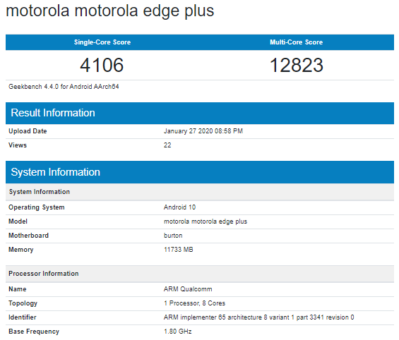 Según aquellos datos, el Motorola Edge + contaría con un procesador Qualcomm Snapdragon 865 y acompañado de nada menos que de 12GB de memoria RAM, además de estar operando con Android 10.