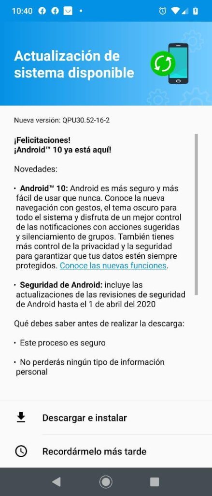 Esta actualización también trae consigo el parche de seguridad Android correspondiente al mes de abril del presente año. Además, te recomendamos que cuentes con una conexión Wi-Fi para descargar la actualización, ya que, al ser una nueva versión de Android, el archivo pesa más.