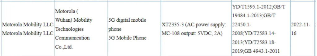 Las capturas puestas dentro de este artículo son documentos devenidos de las certificaciones mencionadas. Sirven como prueba del paso del gadget tanto por la 3C como por TENAA. El equipo está identificado con el número de modelo XT2335-3.