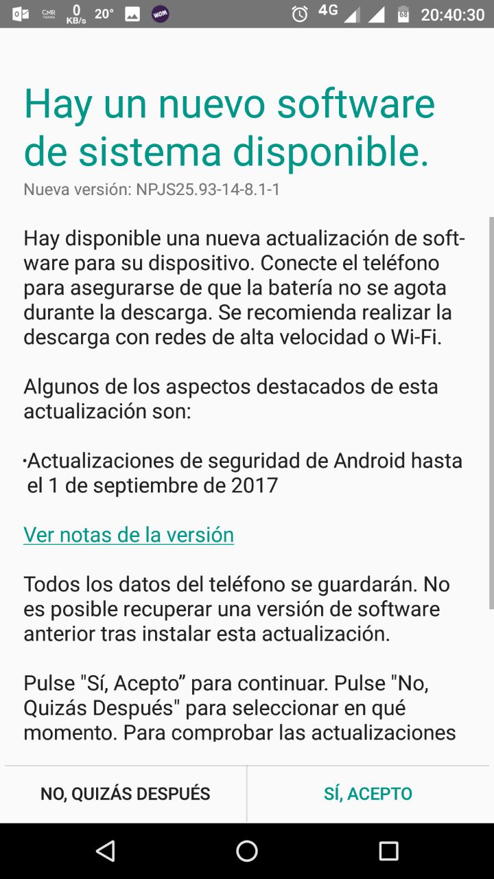 La actualización identificada como NPJS25.93-14-8.1-1 no viene con grandes novedades como probablemente estabas esperando, ya que según lo informado por el aviso de actualización, solo viene a actualizar el parche de seguridad Android al mes de septiembre.