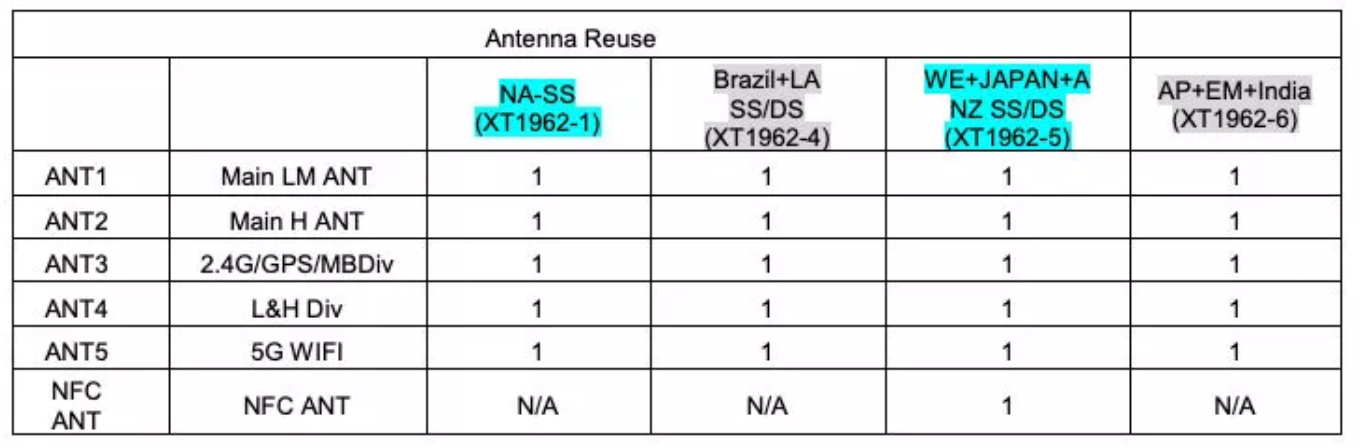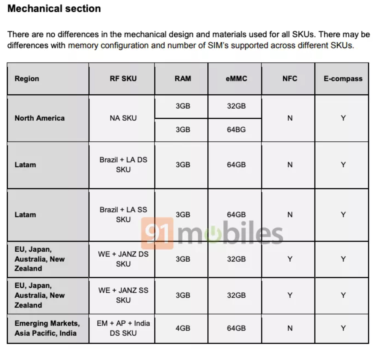La primera imagen que te mostraremos corresponde a una tabla comparativa de las zonas a las cuales arribará este móvil. Según el mercado, las memorias RAM y ROM, y la conectividad NFC se alternan.