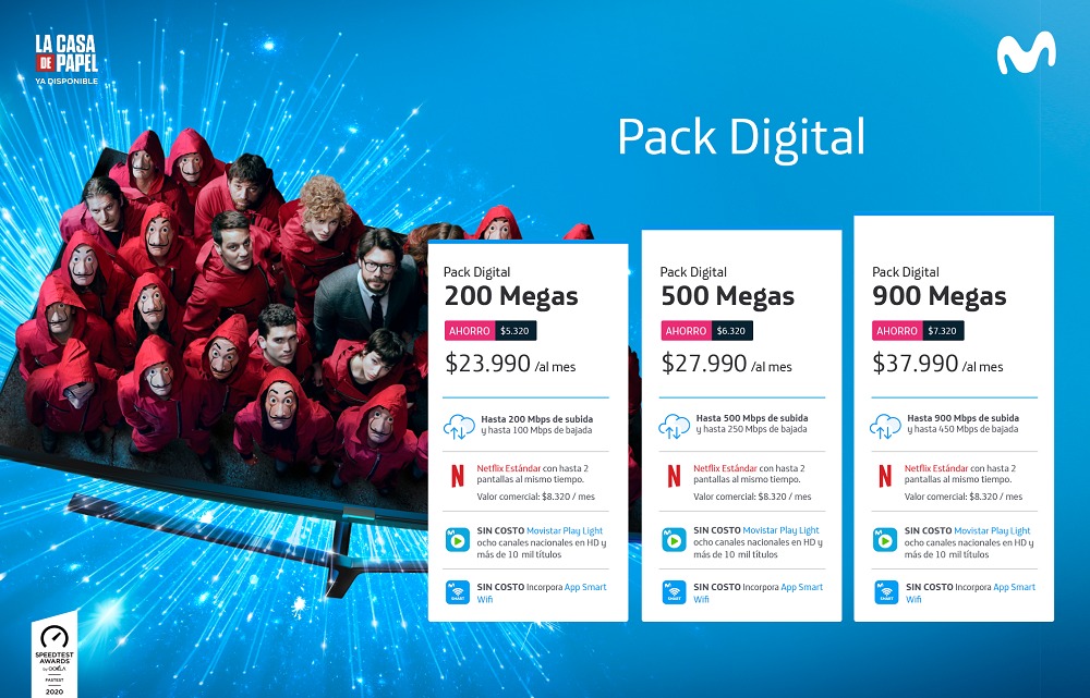 Los nuevos Pack Digital de Movistar Chile consisten en tres planes que incluyen 200, 500 o 900 Mbps de velocidad de descargar, y cada uno de ellos incluye la suscripción Estándar a Netflix (2 pantallas HD), más acceso a Movistar Play Light.