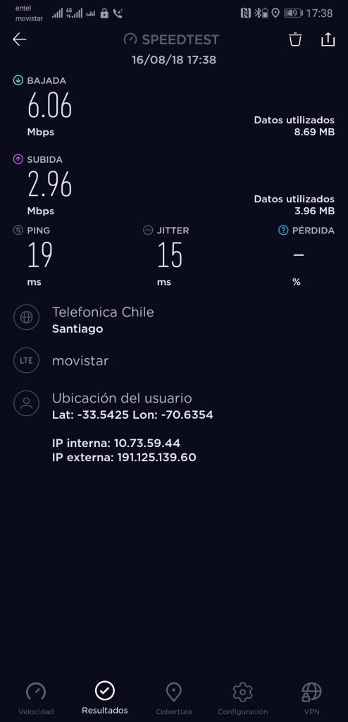 La captura superior fue tomada a pasos de la estación de metro La Granja de la Línea 4 y en ella se puede apreciar que nuestro Huawei P20 Pro estaba conectado a esta red 4G de Movistar. De hecho estábamos con un chip prepago y teníamos datos móvil, logrando realizar una prueba de velocidad.