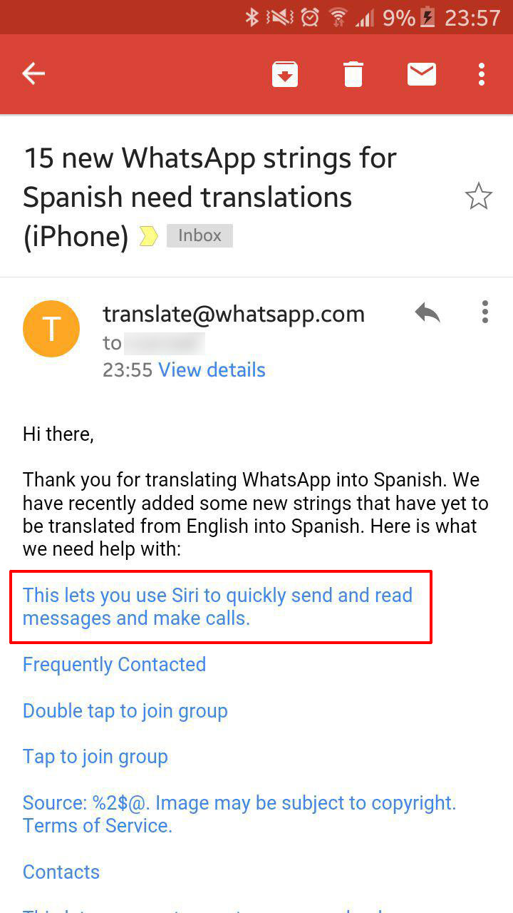 Es bueno saber que los desarrolladores se tomaron enserio esta propuesta, ya que estamos ad portas de ver su aplicación en una de las aplicaciones más populares del mundo: WhatsApp. La evidencia llega a través de las lineas de traducción que la empresa solicita a la comunidad, donde destaca la primera frase de la imagen.