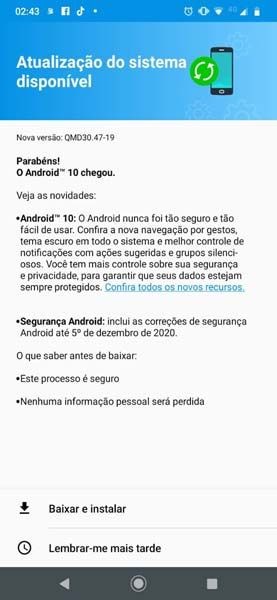 Las unidades comercializadas en Brasil son quienes comenzaron a reportar la llegada de dicho update bajo el número de versión de firmware QMD30.47-19. Es decir, es el mismo Android 10 que Motorola impulsó al One Macro en India hace unas semanas y tiene un tamaño de aproximadamente 1,46 GB.