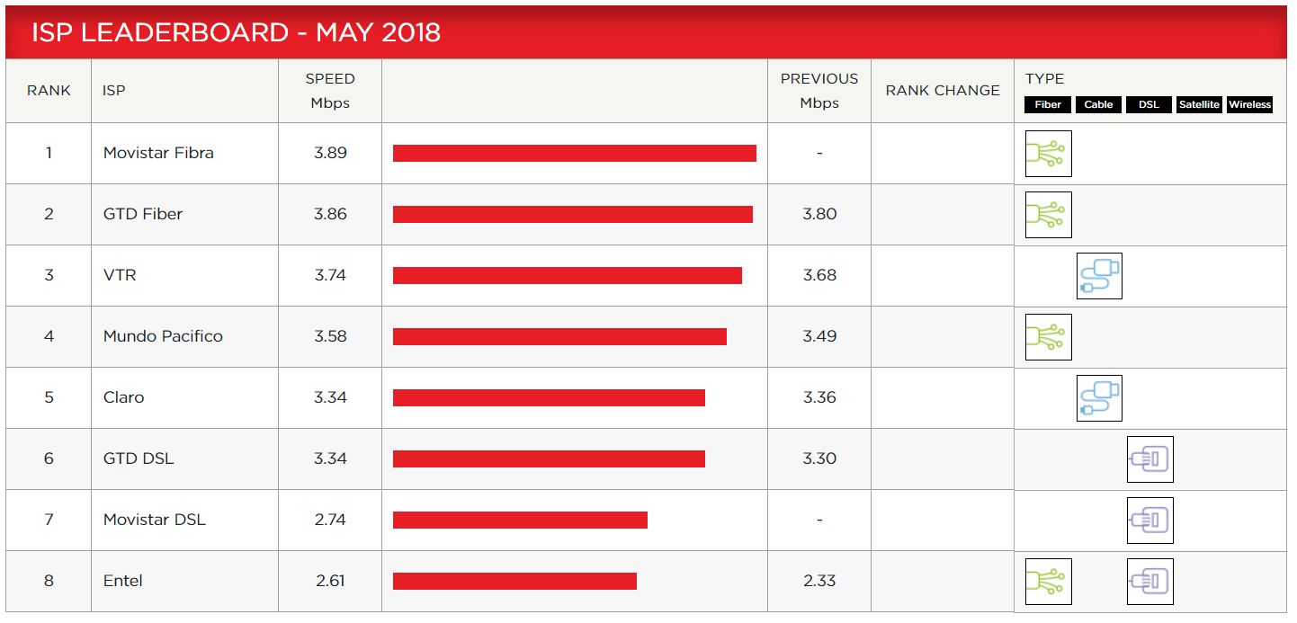 En primer lugar –pero de forma muy ajustada– está Movistar con su servicio de fibra óptica, seguido muy de cerca por el grupo GTD con el mismo tipo de servicio. Un poco más atrás encontramos a VTR y Mundo Pacífico, el cual ofrece la más altas cantidades (en el papel) en su oferta comercial.