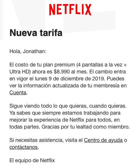 Netflix anunciaba en aquel correo que desde del 9 de diciembre, las tarifas de nuestros planes contratados van a aumentar, para ser los mismos precios que vimos hace dos meses atrás.