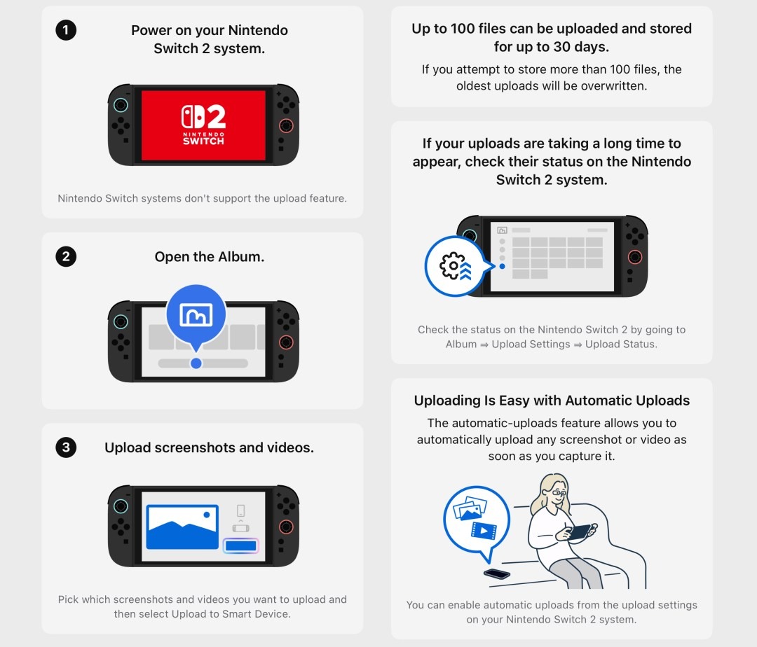 Ahora, el álbum de la Switch 2 contará con una nueva opción denominada «Subir a dispositivo inteligente» para enviar capturas de pantalla manualmente, así como una función de carga automática en la que las 100 capturas de pantalla y vídeos más recientes de la consola estarán disponibles en la app.