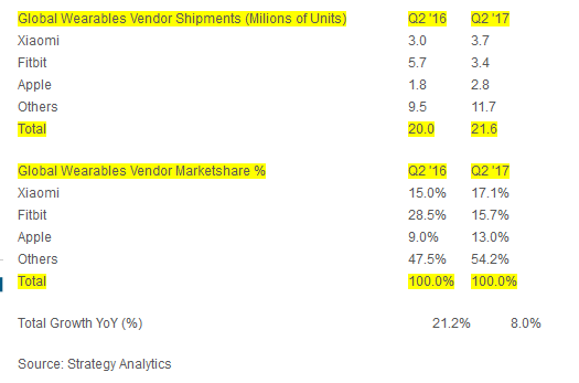 Finalmente, si miramos cifras globales, 21.6 millones de wearables fueron vendidos en el segundo trimestre de este año, un 8% de subida con respecto al primer trimestre del año, lo que representa un alza neta de 20 millones de unidades comercializadas.