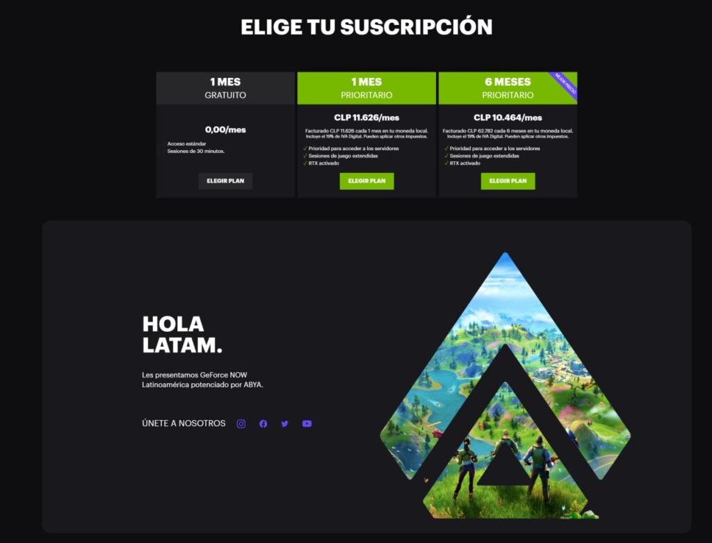 GeForce Now está disponible en tres planes, el primero es gratuito con sesiones de 30 minutos, mientras que los planes de pago habilitan sesiones de juegos extendidas, cuentan con prioridad para acceder a los servidores y activan el uso de gráficas RTX. 1 mes tiene un precio de CLP $11.626, mientras que 6 meses pueden ser facturados en un solo pago que lo reduce a CLP $10.464.