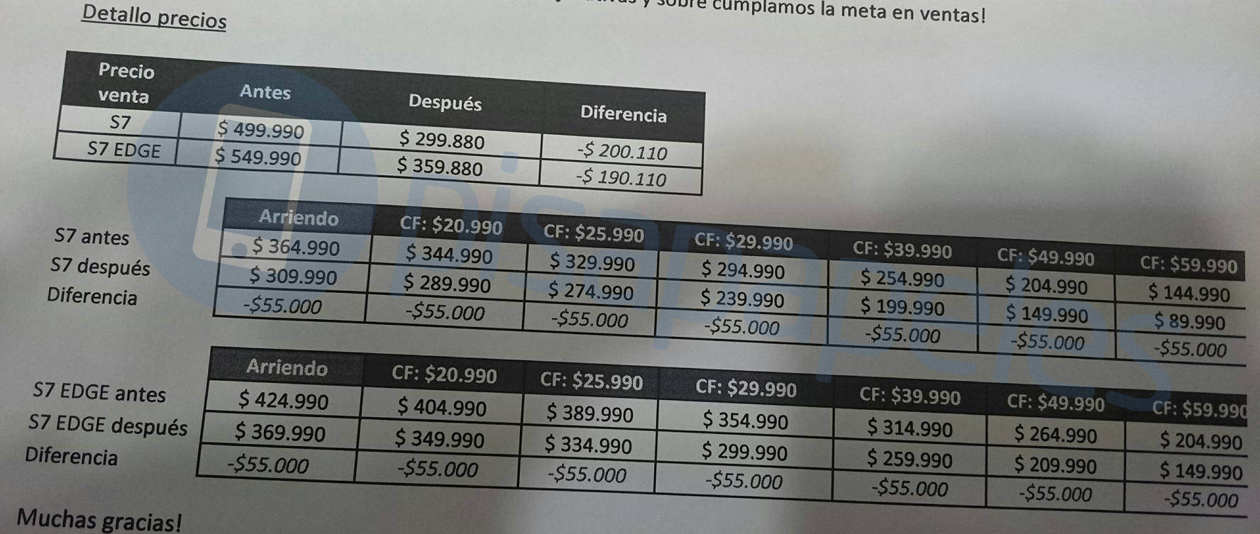 Como podemos ver en la imagen, su valor de venta se verá reducido considerablemente. El Galaxy S7 costará CLP $299.880 y el Galaxy S7 Edge llega a los CLP $359.880. Lo mismo pasará con las modalidades de arriendo, donde vemos que un plan de CLP $29.990 permitirá acceder al Galaxy S7 por CLP $239.990 y al Galaxy S7 Edge por CLP $299.990.