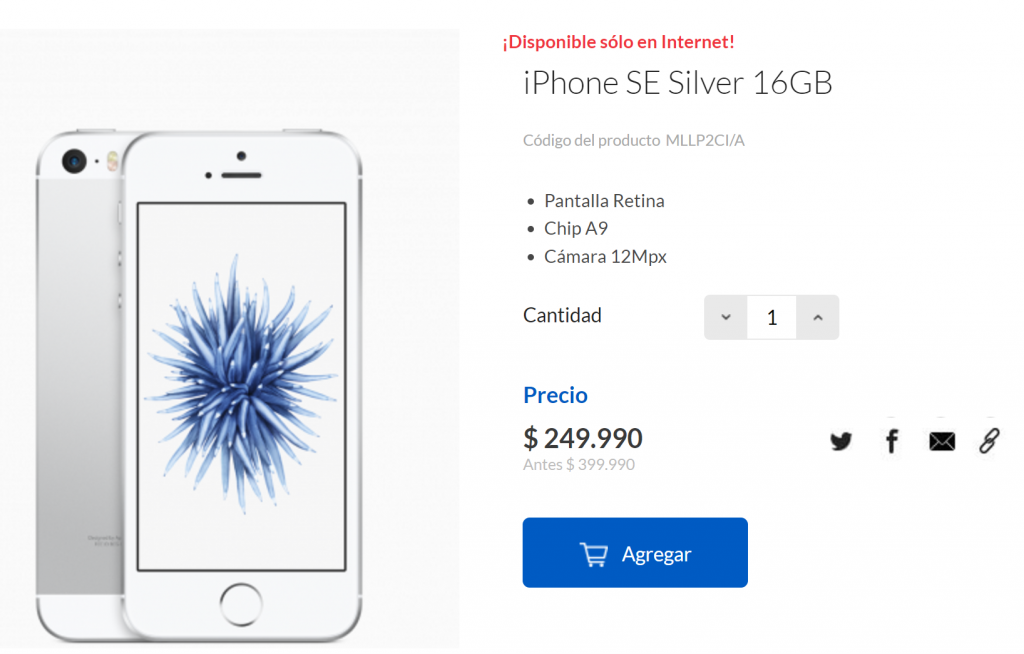 ¡Corran! Reifstore está ofreciendo un descuento especial en el iPhone SE de 16GB (y también el de 64GB) por el día de las madres. Al momento de escribir este post, solo quedan disponibles en silver para el modelo de menor capacidad, por lo que si quieren aprovechar este tremendo descuento, les recomendamos comprarlo de inmediato.