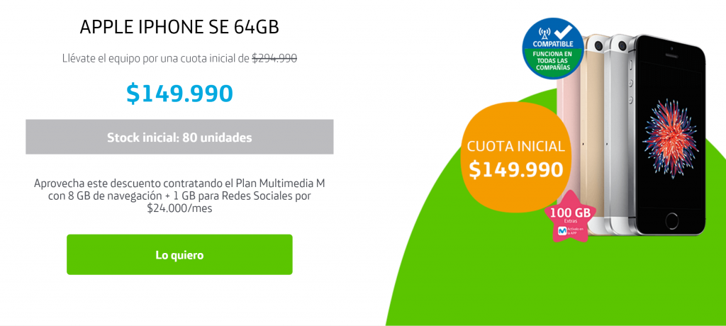 Una de las principales ofertas es la del iPhone SE de 64GB por tan solo CLP $149.990. Para acceder a este precio debes portarte a Movistar con el Plan Multimedia M de CLP $24.000 mensuales, el cual incluye 8GB libres y 1GB exclusivo para redes sociales, además de la bolsa extra de 100GB por 90 días. Esto representa un 50% de descuento respecto al precio original del equipo con ese mismo plan.