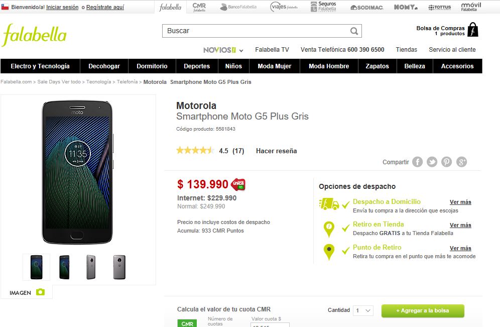 Notable bajada de precio para el modelo más grande de los G5 de Motorola. Esta vez es el Moto G5 Plus el que está con cerca de un 35% de descuento en Falabella.