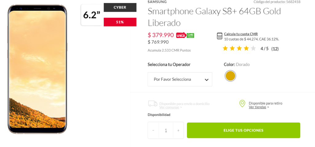 ¡Partimos con las ofertas del CyberMonday de este año! La primera que ubicamos fue en Falabella. Hablamos de un tremendo equipo como lo es el Samsung Galaxy S8+ en su versión de 64GB, este lo encontramos a un precio de CLP $379.990, aunque para aprovecharlo tendrás que utilizar tu tarjeta CMR.
