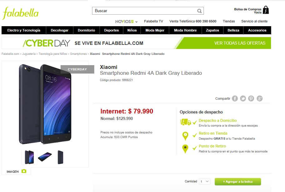 La oferta está disponible en Falabella mediante compra con medio de pago via web, es decir, no es necesaria la tarjeta CMR. El precio normal del Redmi 4A es de CLP $129.990 y con el descuento del #CyberDayCL queda en CLP $79.990. Para acceder al descuento puedes ingresar aquí.