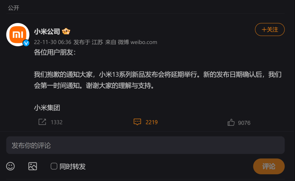 El comunicado dice lo siguiente si lo traducimos al español: «Estimados usuarios. Lamentamos informarle de que el lanzamiento de la nueva serie 13 de Xiaomi se pospondrá. Le informaremos en cuanto se confirme la nueva fecha de lanzamiento. Gracias por su comprensión y apoyo.»