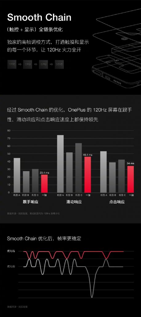 Smooth Chain es un agregado que representa una combinación optimizada de hardware y software a lo largo de toda la cadena de entrada táctil y la salida de pantalla, de modo que el retraso entre la entrada y la respuesta puede reducirse lo más bajo posible. Luego está Motion Estimation, Motion Compensation (MEMC), una capa inteligente de inserción de fotogramas e interpolación que puede procesar videos de baja velocidad de cuadros hasta 120 fps simulados.