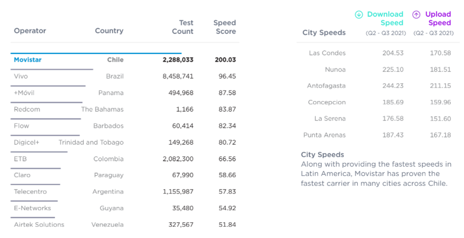 Mismo resultado obtuvimos en Latinoamérica, donde Movistar Chile dejó en segundo lugar a Vivo de Brasil, Móvil de Panamá en tercer lugar y Redcom de Bahamos en el cuarto. En términos de ciudades, Las Condes, Ñuñoa y Antofagasta son las más rápidas.
