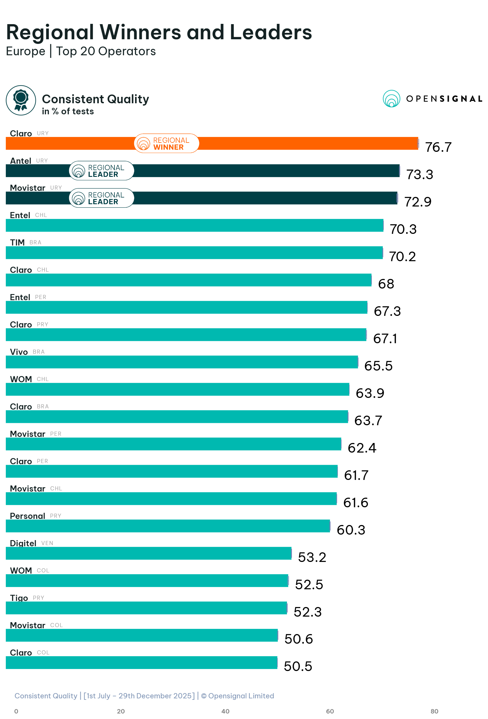 En Consistent Quality, el primer lugar regional es para Claro Uruguay con 76,7%. Luego aparecen Antel Uruguay con 73,3 y Movistar Uruguay con 72,9. Otra vez, el dominio del mercado uruguayo es muy marcado en la zona superior del gráfico.