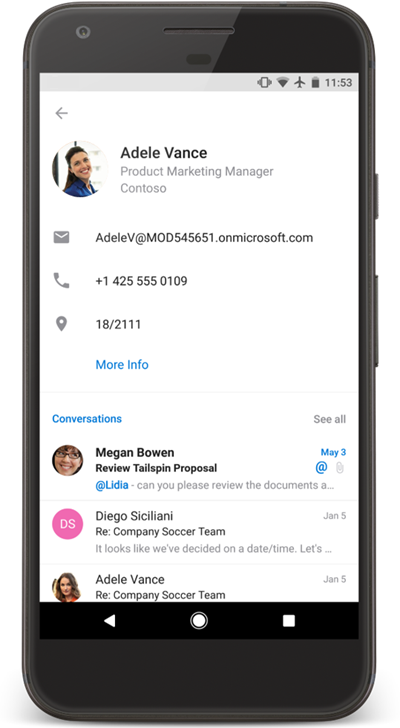 Así mismo, se ha rediseñado la tarjeta de contactos de Outlook, por lo que ahora podrás ver más detalles como una foto de contacto, la ID de Skype, otras direcciones de correo, entre otros detalles. Además, esta tarjeta de contactos te permitirá elegir el tipo de llamada — en caso de realizar una — ya sea por FaceTime, llamada normal, por Skype, etc.