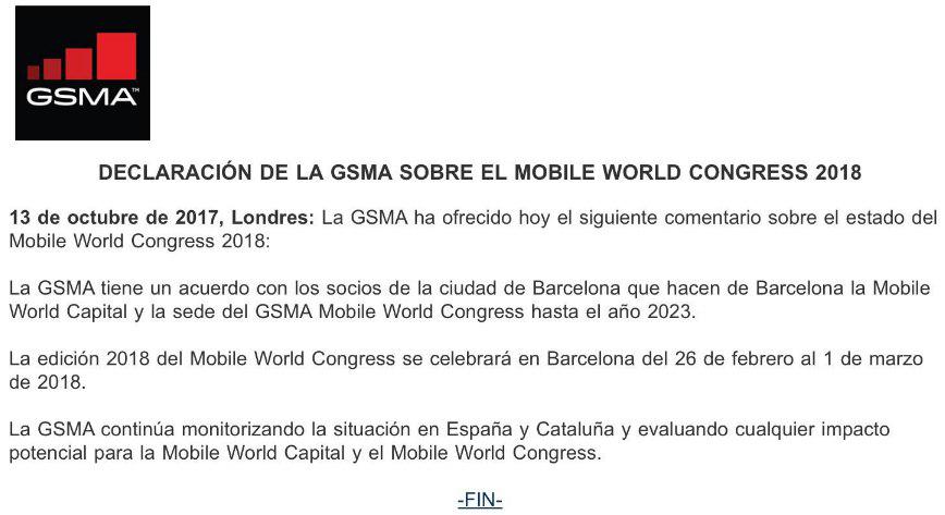 Esto estaba provocando ciertas dudas respecto de la edición del 2018 del MWC, aunque la GSMA, entidad organizadora, se ha encargado de aclarar la situación de forma contundente: