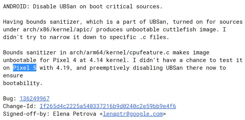 Para no complicarnos demasiado con los datos técnicos y duros, digamos que en el mensaje de arriba el dispositivo en cuestión está asociado con una función de optimización de bajo nivel llamada UndefinedBehaviorSanitizer (UBSan). La misma genera problemas de arranque. Asimismo, el Pixel 5 está ejecutando el kernel de Linux 4.19, mientras que el Pixel 4 se encuentra con el 4.14.