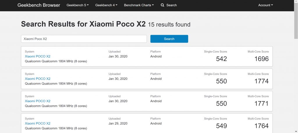 Ahora bien, es importante señalar que, al momento de redactar este artículo, si uno accede al buscador de Geekbench se encontrará con un total de 15 resultados para «POCO X2», tal como lo vislumbra la siguiente ilustración: