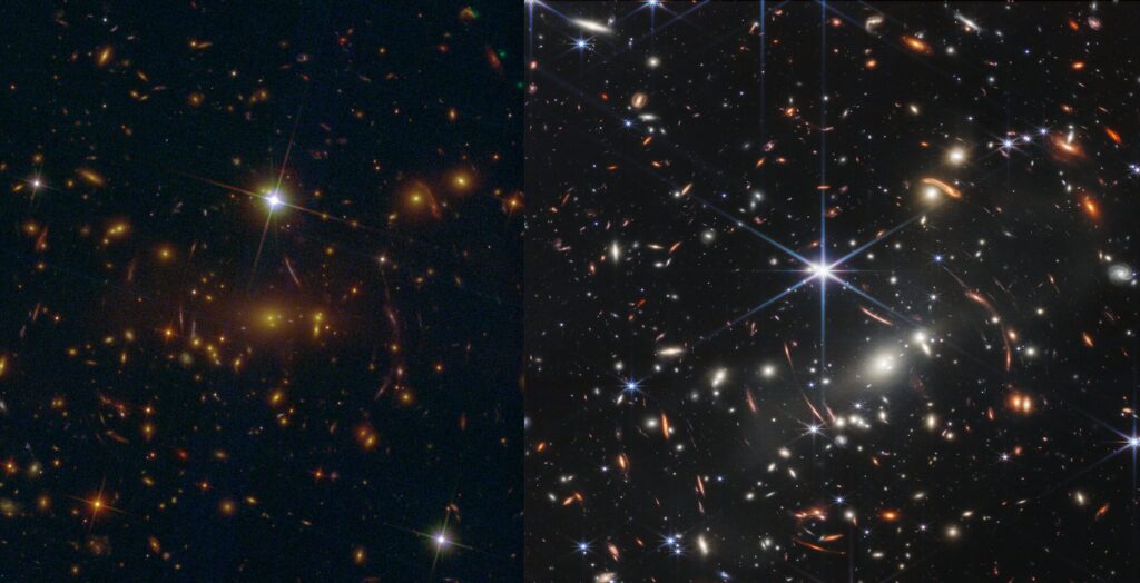 Los usuarios de Twitter Eurekablog y ita_dc, en sus cuentas, han publicado unas imágenes comparando estas tomas del espacio obtenidas a partir de los telescopios espaciales Hubble y Webb, las cuales te dejamos a continuación:
