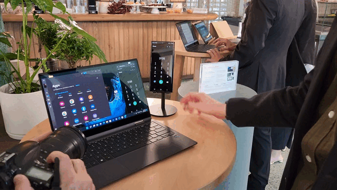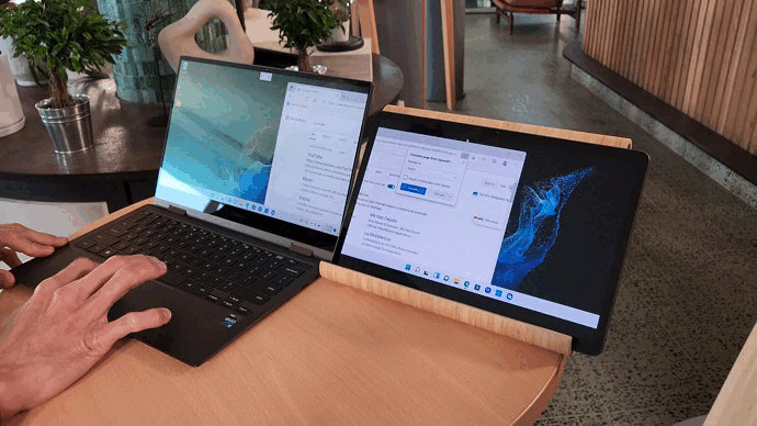 Como podemos ver en el gif, y como mencionamos también en la nota de lanzamiento, es posible arrastrar ventanas de una a otra pantalla gracias a la funcionalidad de pantalla extendida de Windows + la tablet Galaxy Tab S8 de Samsung.