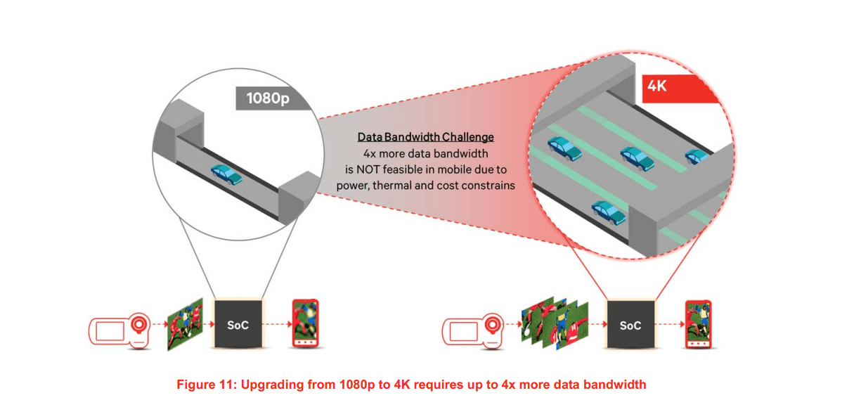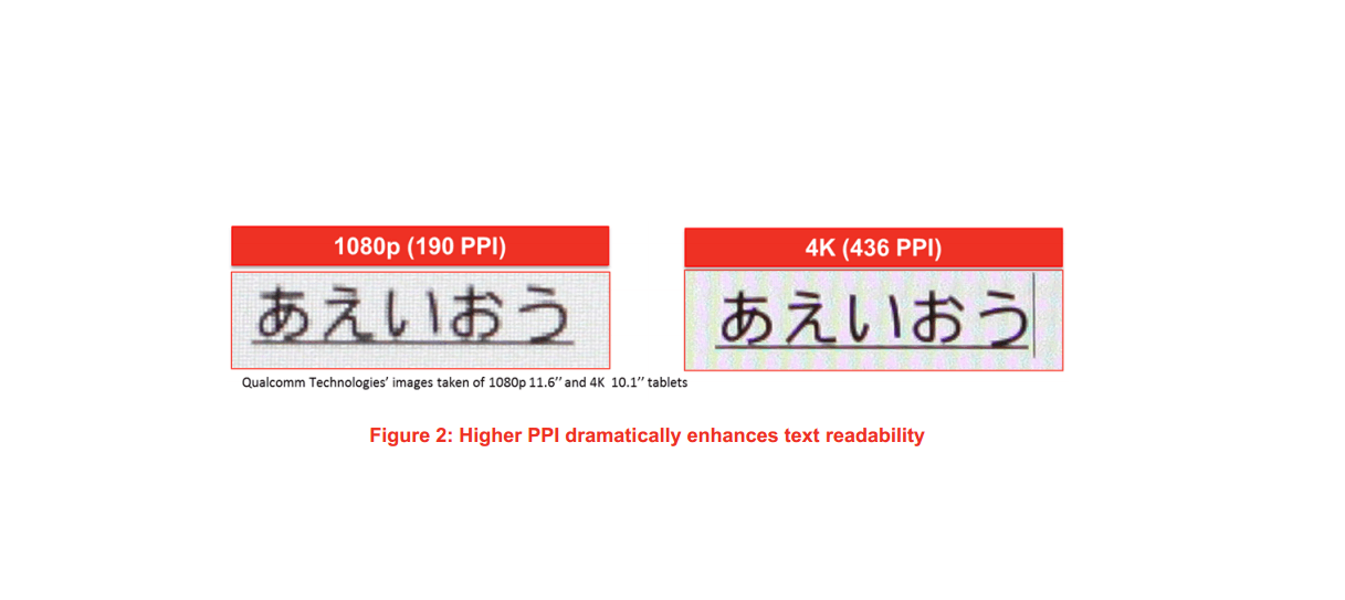Otro aspecto beneficioso de una mayor resolución, es una mayor densidad de pixeles, en el caso anterior se aprecian dos ejemplos de pantallas de 10.1 pulgadas pero con densidades de 190 ppp (1080) y 436 ppp (4K) respectivamente, en el cual se puede apreciar el aumento de la nitidez en la imagen. Además la compañía estadounidense indica que con el nuevo procesador Qualcomm Snapdragon 805 es capaz de mover dicha resolución sin problemas.