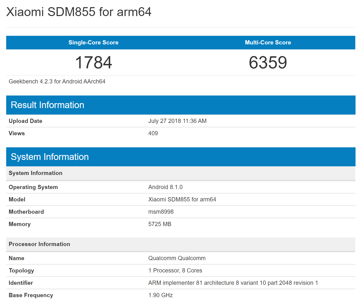 Allí puede apreciarse cómo arriba a la izquierda se lo identifica como Xiaomi SDM855 for arm64. Con lo de «SDM855» se da por sobreentendido que se trata del mismísimo Qualcomm Snpadragon 855.