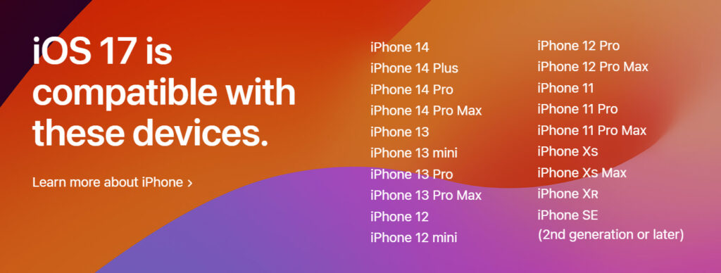 Esta información la obtuvimos en el sitio de preview de iOS 17. Según esa página, el último software mencionado es compatible con: iPhone SE de segunda generación y posterior, iPhone XR, iPhone Xs Max, iPhone Xs, iPhone 11, iPhone 11 Pro, iPhone 11 Pro Max, iPhone 12, iPhone 12 mini, iPhone 12 Pro, iPhone 12 Pro Max, iPhone 13, iPhone 13 mini, iPhone 13 Pro, iPhone 13 Pro Max, iPhone 14, iPhone 14 Plus, iPhone 14 Pro y iPhone 14 Pro Max.