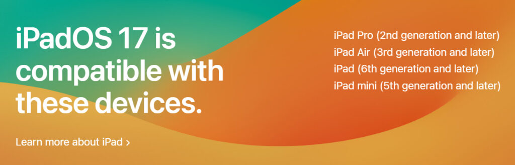 iPadOS 17 en la web de preview de Apple aparece compatible con: iPad mini de quinta generación y posterior, iPad estándar de sexta generación o más nueva, iPad Air de tercera generación o superior y iPad Pro de segunda generación en adelante.