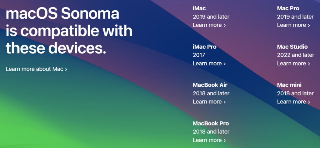 El nuevo sistema operativo para computadoras es macOS Sonoma. En la web de su preview figura compatibilidad para con: iMac 2019 y posteriores, iMac Pro o superior, Mac Pro 2019 y más nuevas, Mac Studio de 2022 o posterior, MacBook Air de 2018 o más reciente, Macbook Pro desde el 2018 y con Mac mini de 2018 o más nueva.