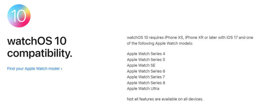 MacRumors señala que son compatibles las mismas versiones para con watchOS 9. Es decir, watchOS 10 se ejecutará en: Apple Watch Series 4, Apple Watch Series 5, Apple Watch SE, Apple Watch Series 6, Apple Watch Series 7, Apple Watch Series 8 y Apple Watch Ultra.