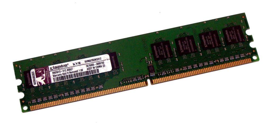 –DDR: Disponible de forma comercial desde el 2002 (aunque fue lanzada el año 2000), esta memoria trabaja a un voltaje entre 2.5 y 2.6 V. Sus velocidades alcanzaban un máximo real de hasta 400 MHz, pero 200 MHz son efectivos y podíamos encontrar presentaciones hasta 1 GB debido a que la densidad máxima por módulo (chips) era de 128 MB. Acá hablamos de velocidad efectiva ya que, por ejemplo, se comercializaban memorias RAM DDR-400, pero debido al carácter DDR la transferencia es doble, o bien, la memoria realiza 2 operaciones por segundo, y por eso la velocidad efectiva se multiplica por dos. Acá la tarjeta tiene una cantidad de 184 pines de contacto.
