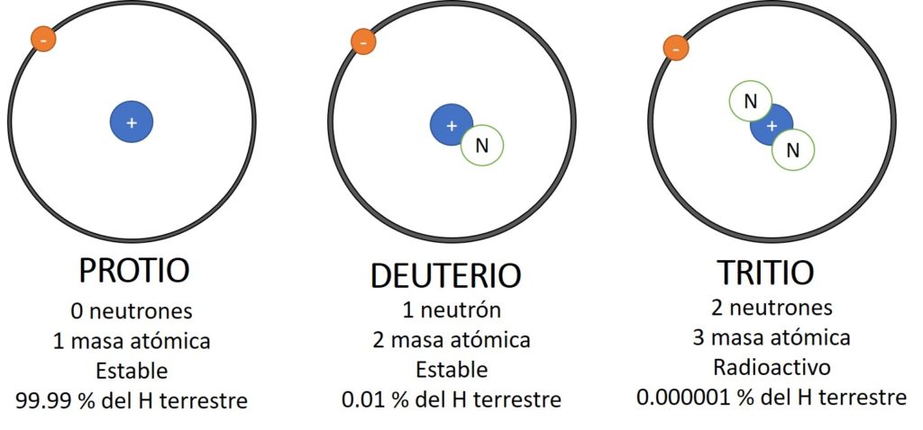 Recordemos que los isótopos son aquellos átomos que tienen el mismo número atómico (o de protones), pero diferente número de neutrones, por tanto, su número másico (neutrones + protones) puede variar. Particularmente cuando el número de neutrones no es la correcta y se manifiesta una inestabilidad del núcleo del átomo debido a un exceso de energía nuclear, hablamos de un isótopo radiactivo o radioisótopos. En la siguiente figura, el Tritio es el isótopo radiactivo del Hidrógeno: