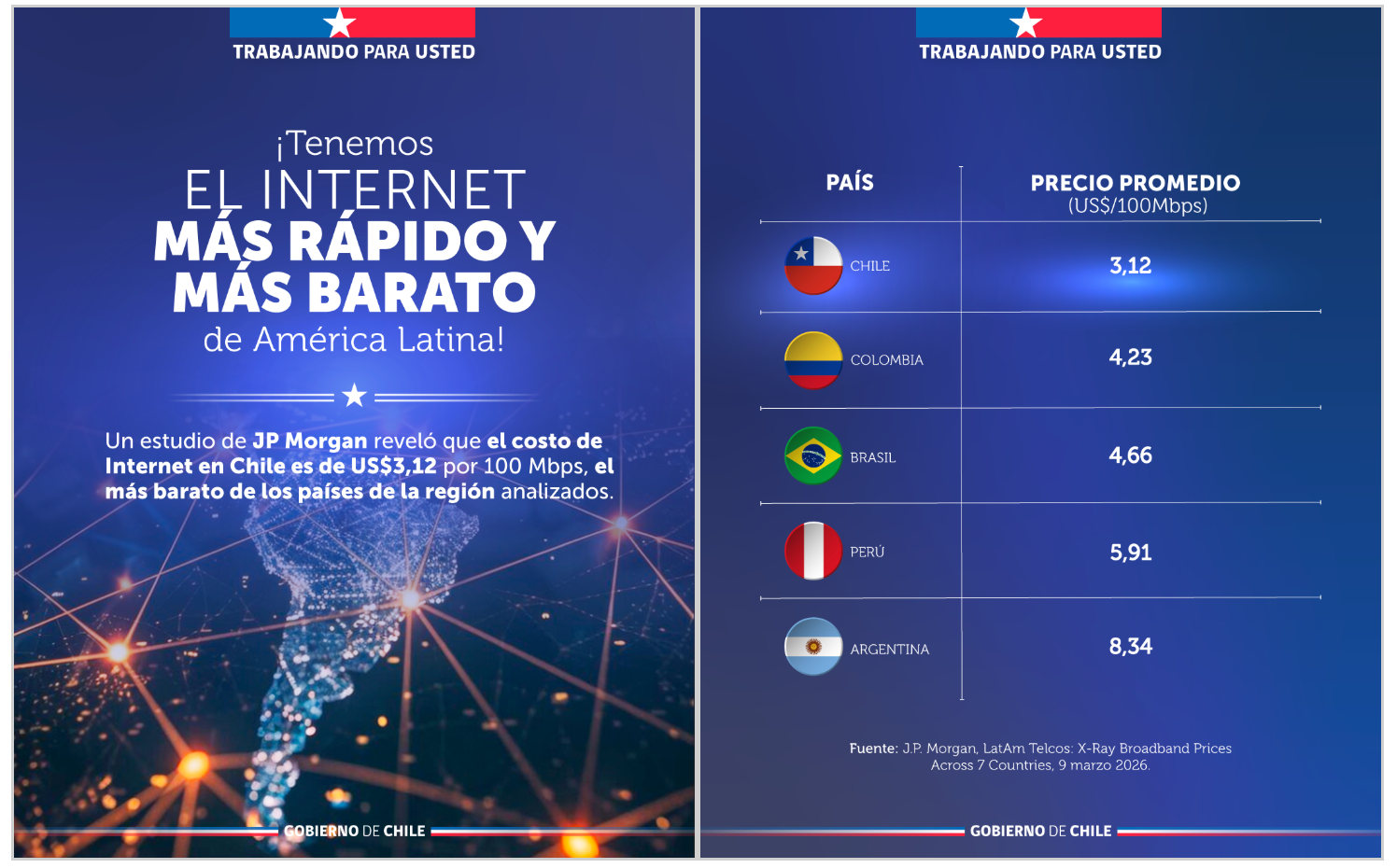 El precio resulta ser un factor fundamental para que todos puedan acceder a esta conexión desde sus hogares. De hecho, un estudio internacional realizado por JP Morgan confirmó que Chile cuenta con el internet fijo más barato de toda América Latina, con un valor de apenas US$3,12 por cada 100 Mbps de velocidad.
