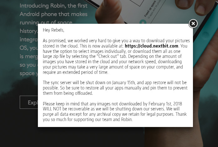 Tras la adquisición de la compañía, el futuro del Nextbit Robin era incierto, pues todos los rumores indicaban a que Razer iba a lanzar su propio teléfono destinado para los jugadores. En agosto se anunció que el dispositivo dejaría de tener soporte, aunque hasta el momento seguiría recibiendo algunas actualizaciones. Hoy, la compañía ha anunciado que la característica de almacenamiento en la nube será dado de baja a partir del próximo 1 de marzo.