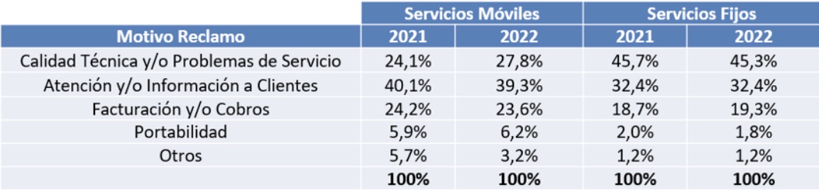 Respecto a los motivos más reclamados por los consumidores, en el caso de los servicios móviles los usuarios se quejaron, principalmente, por la mala calidad de la atención e información a los clientes (39,3%) recibida de parte de las compañías; seguido por inconvenientes de calidad técnica y problemas del servicio (27,8%).
