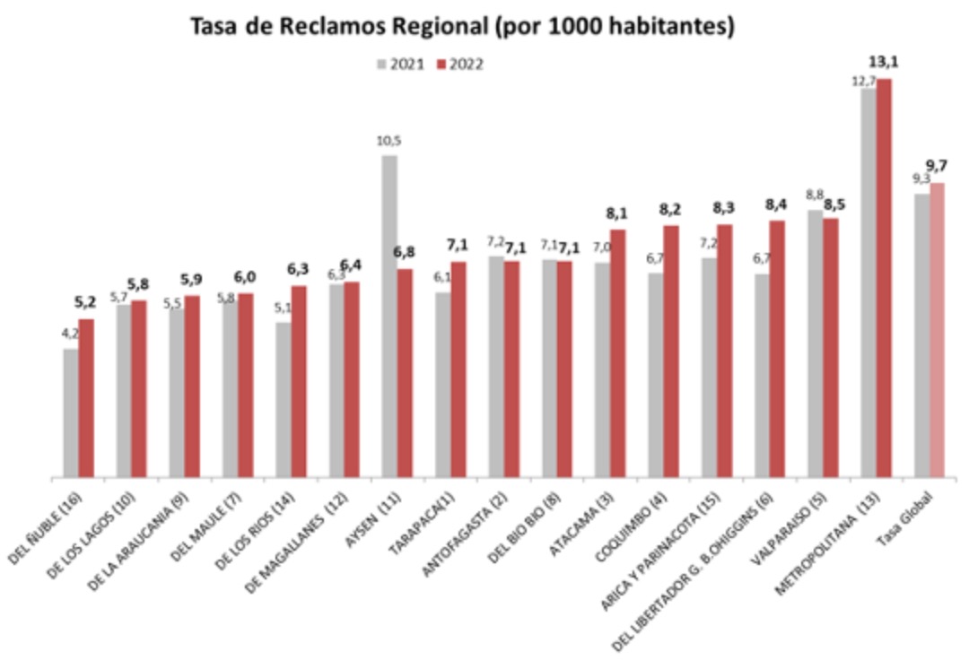 Si analizamos por regiones, vemos que la Región Metropolitana tuvo la tasa más alta con un 13,1 reclamos por cada 1.000 habitantes. Sin embargo, la región de Ñuble presentó la tasa más baja con 5,2 reclamos por cada 1.000 habitantes.