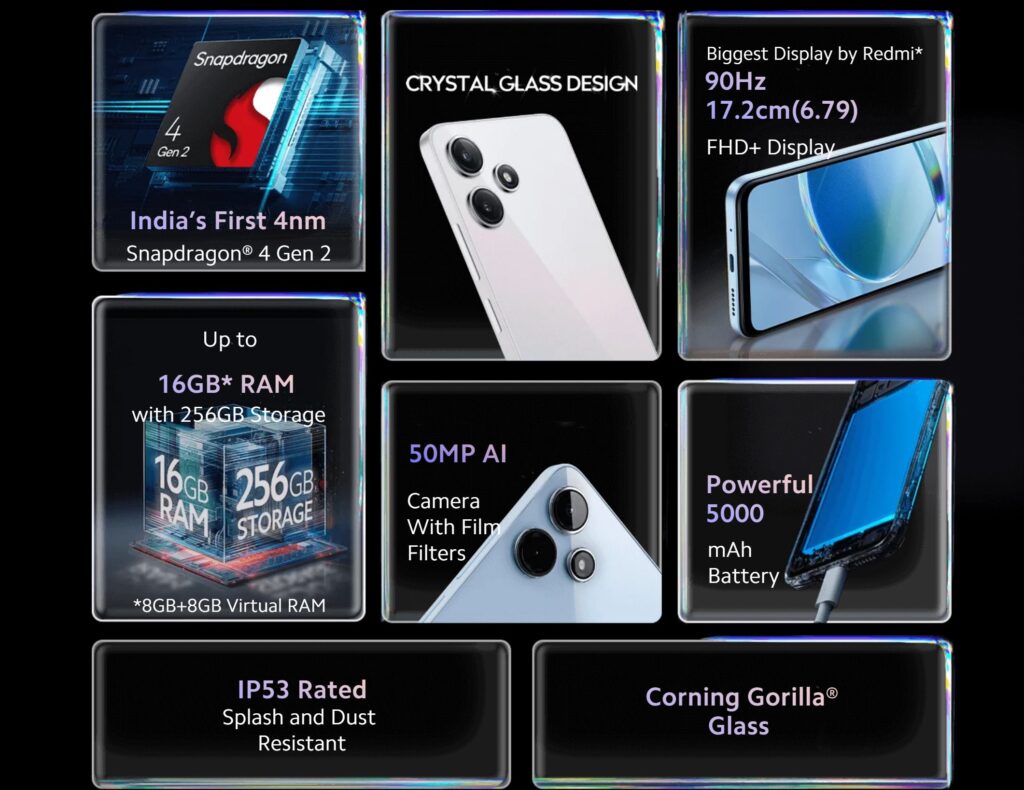 El Redmi 12 5G cuenta, entonces (vía Xiaomi), con una pantalla LCD FHD+ de 6.79 pulgadas con tasa de refresco de 90 Hz. Viene con protección Corning Gorilla Glass en el frontal, mientras que la parte trasera es de vidrio, lo que da sensación premium.