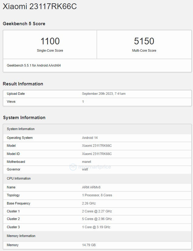 De todas formas, ya apareció evidencia en Geekbench del smartphone. En el sitio de benchmarks, el equipo con nombre clave 23117RK66C hizo gala de su potencia, pues posó con nada menos que con 16GB de memoria RAM.