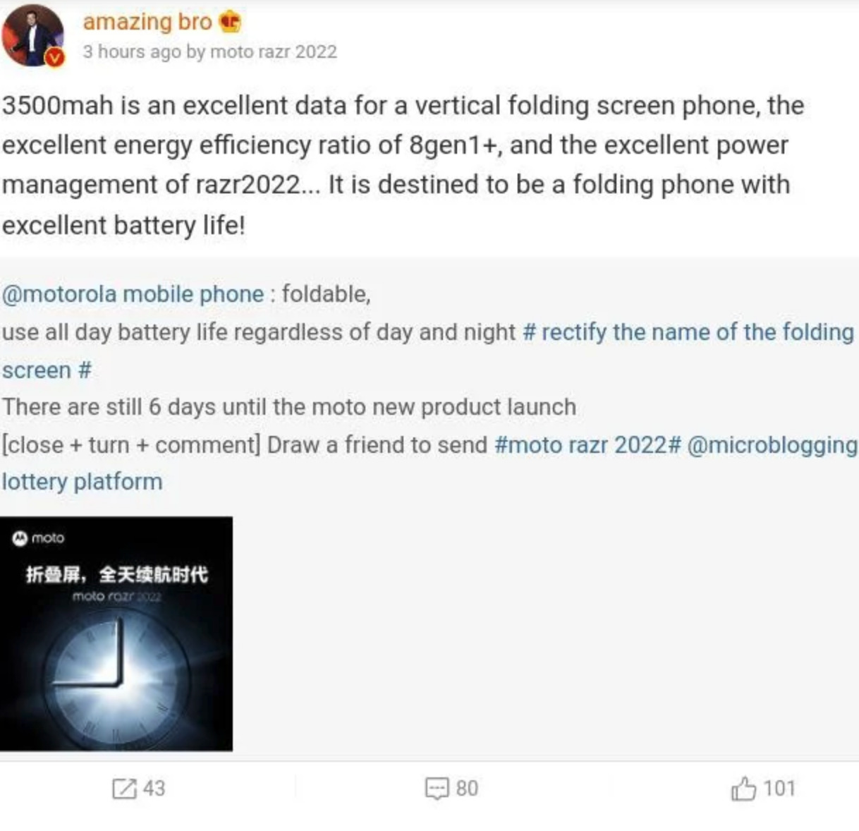 Mientras esperamos al día de su lanzamiento oficial, en una red social asiática llamada Weibo, un supuesto funcionario de la mismísima Motorola habría revelado la capacidad que tendría la batería de este nuevo plegable.