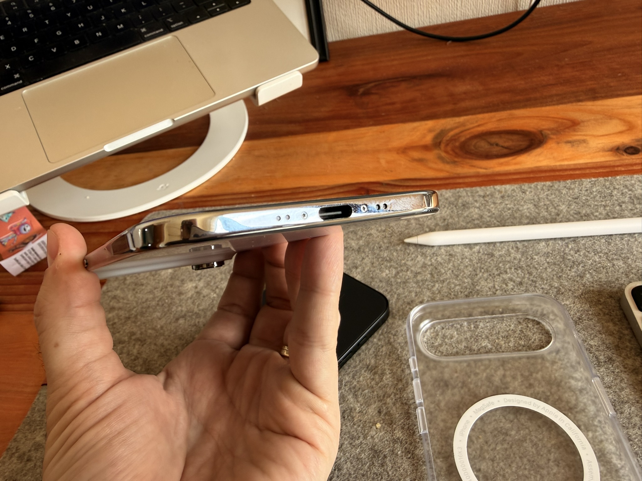 Todo el cuerpo está hecho de titanio, lo que permite mantener un peso bajo y muy buena durabilidad. Obvio sabemos que dado eso, los bordes se manchan muy fácilmente, aunque son tan pequeños que llega a ser casi imperceptible a ratos. Hablando de bordes, los botones y ranura USB-C están muy bien logradas para caber perfectamente, pero dejando un mínimo de holgura para no parecer incómodos.