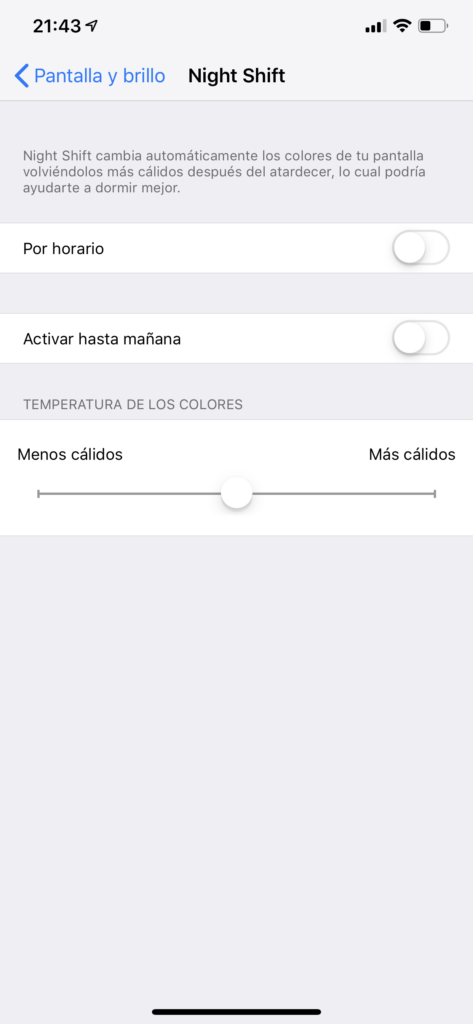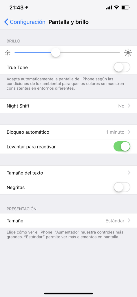 En cuanto a funciones disponibles para la pantalla, podremos controlar el brillo, activar el True Tone que adapta automáticamente el brillo y temperatura de la pantalla para adaptarse a la luz ambiente disponible. También tendremos «Night Shift» que cambiará los colores de la pantalla a unos más cálidos para ayudarte a dormir mejor, entre otras opciones.