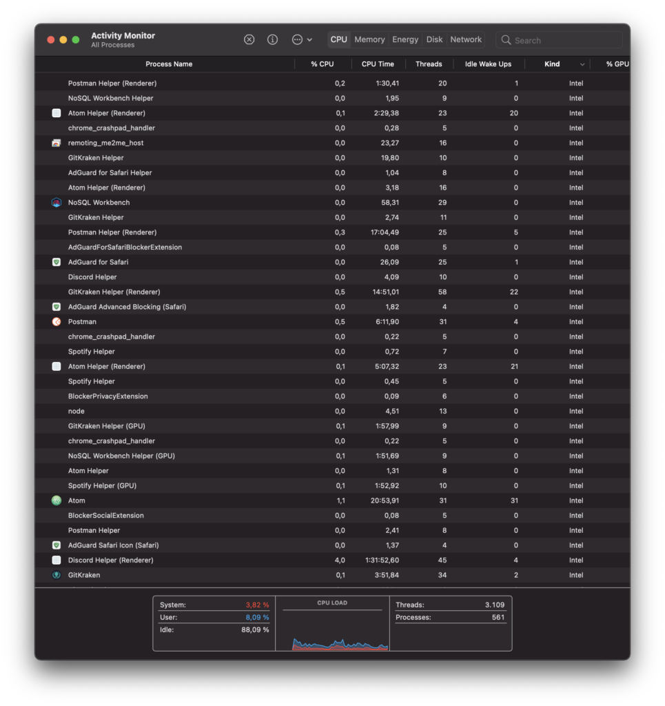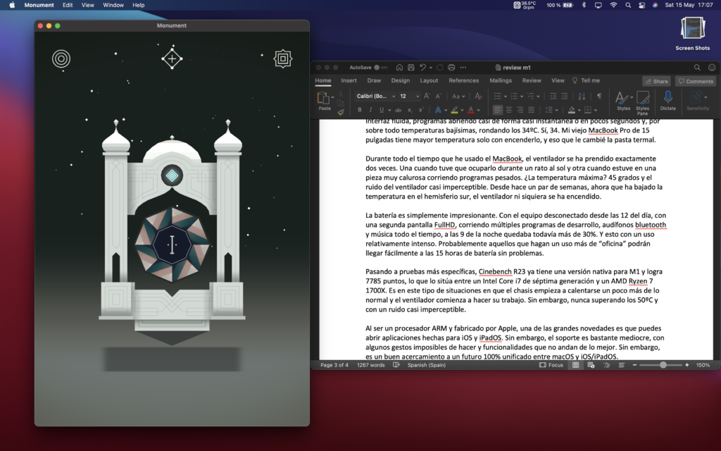 En resumen, el procesador M1 es una bestia. Al momento de escribir este review tengo abierto: Safari, Telegram, Tweetdeck, Spark, Slack, iTerm 2 (corriendo un servidor NodeJS), GitKraken, Atom, Chrome, Postman, una reunión en Zoom y Microsoft Word. Todos programas que no son especialmente livianos, incluso varios de estos todavía corriendo por medio de Rosetta.