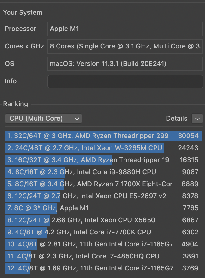 Pasando a pruebas más específicas, Cinebench R23 ya tiene una versión nativa para M1 y logra 7785 puntos, lo que lo sitúa entre un Intel Core i7 de séptima generación y un AMD Ryzen 7 1700X. Es en este tipo de situaciones en que el chasis empieza a calentarse un poco más de lo normal y el ventilador comienza a hacer su trabajo. Sin embargo, nunca superando los 50ºC y con un ruido casi imperceptible.